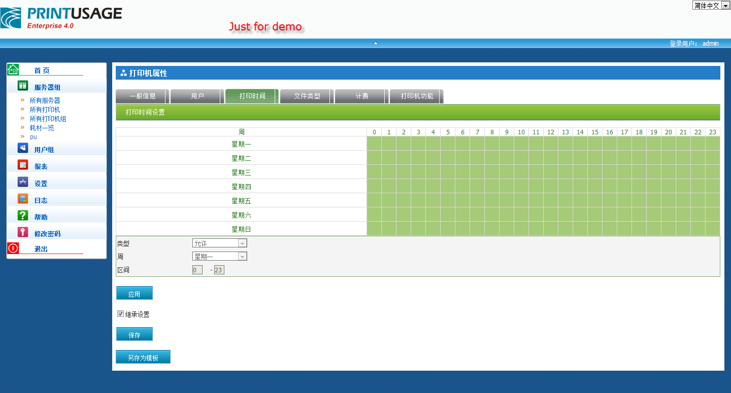 功能说明:设定这台打印机上监控的时间。默认情况,任何时间均监控。可设定“监控时间外禁止打印”来设定只有指定的时间内,这台打印机才提供打印服务。默认继承所属服务器的设定,也可另行设定
