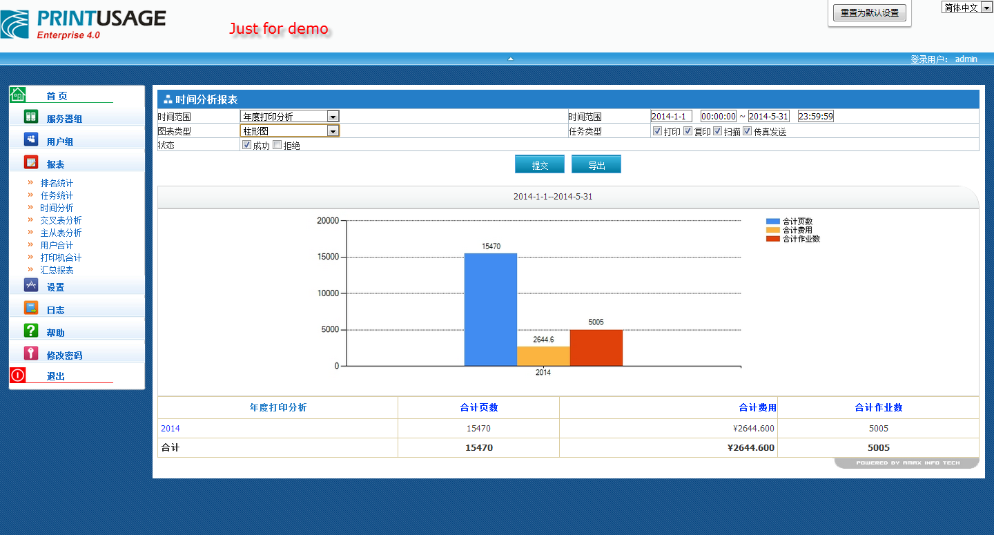 | 报表->时间分析->年度打印分析 报表说明:反映指定时间段中,打印任务按年度分布的情况。